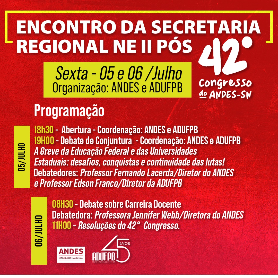 A ADUFPB vai sediar, na sexta-feira (5) e no sábado (6) o Encontro da Secretaria Regional Nordeste II Pós do Andes – Sindicato Nacional, que debaterá a conjuntura política, a carreira docente, a greve das Instituições Federais de Ensino, os desafios para a continuidade da luta e as Resoluções do 42º Congresso do Sindicato Nacional, realizado no início deste ano, em Fortaleza.