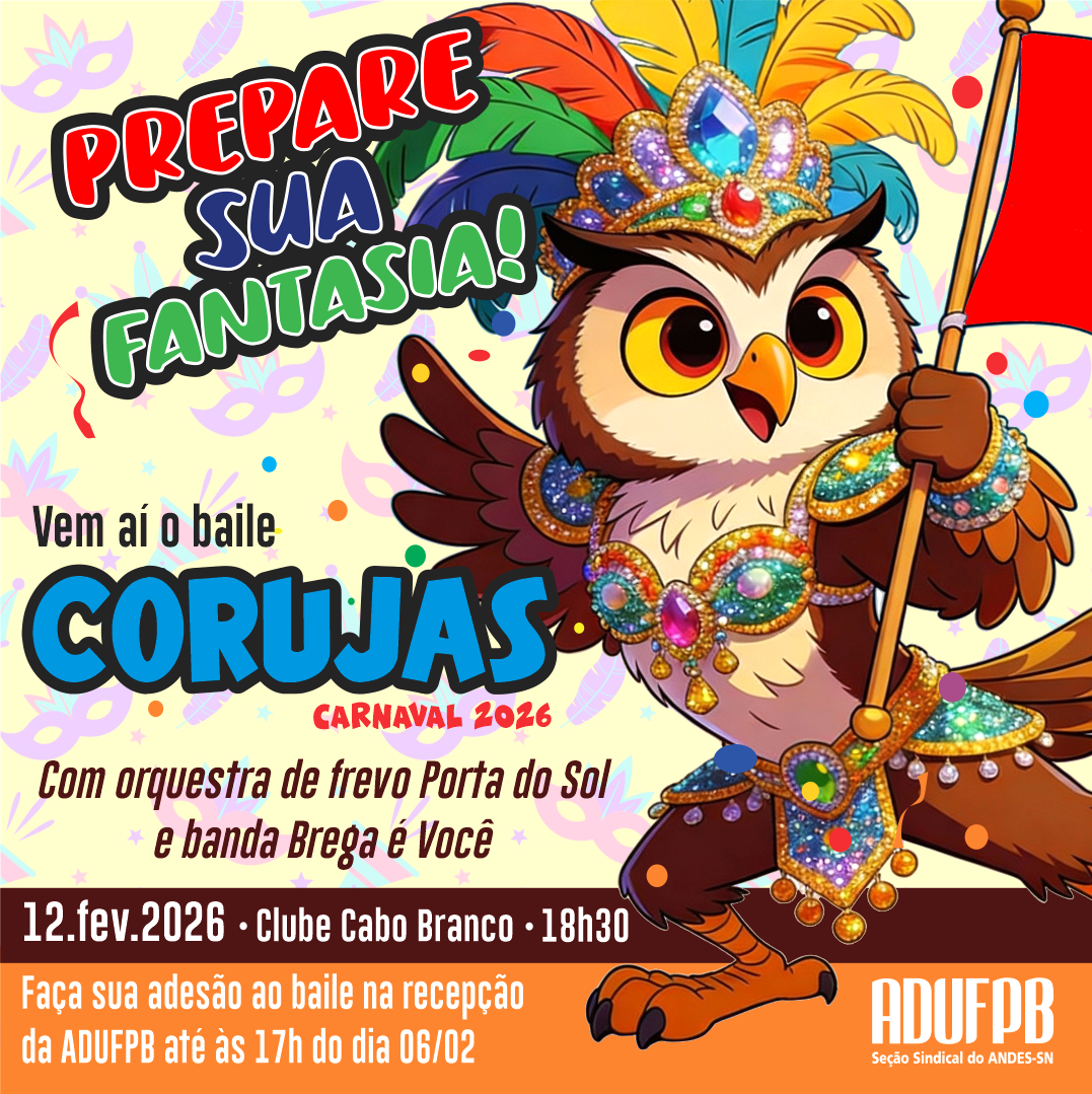 Preparem- se para o frevo, sambas e marchinhas. Separem as fantasias para a folia mais irreverente do ano! A ADUFPB convida os/as Docentes filiados/as para o Baile “Bloco Corujas”/ 2026. O Baile Carnavalesco do “Bloco Corujas” é organizado pelo sindicato e preza pela tradição da festa à fantasia, com direito a concurso para a escolha dos/das docentes caracterizados(as) de forma criativa e divertida, animados/as nessa festa momesca.