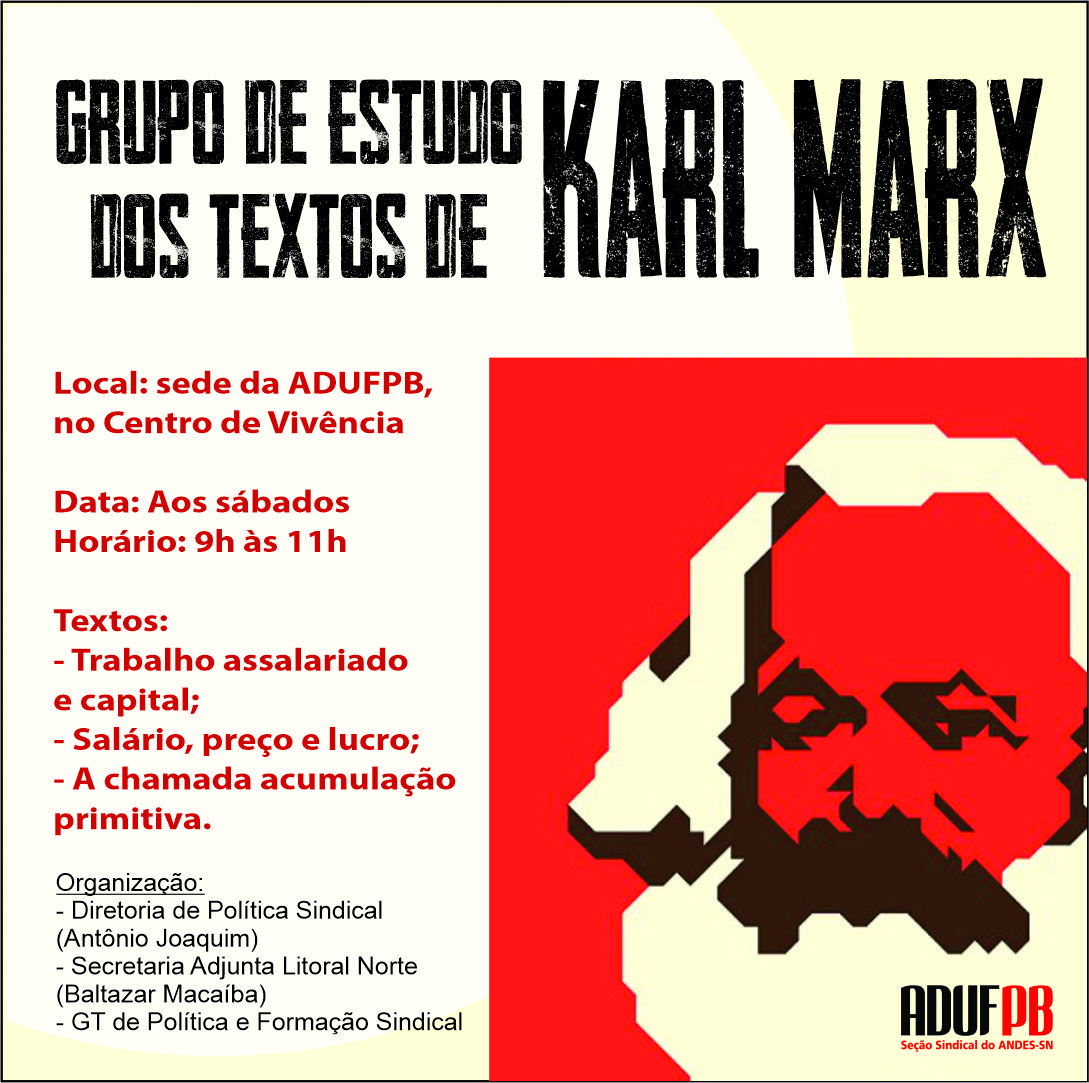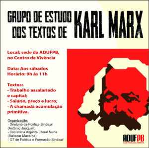 Os encontros, são abertos a todas as pessoas interessadas, ocorrem sempre aos sábados, das 9h às 11h, na sede da ADUFPB, localizada no Centro de Vivência do campus I, em João Pessoa. Serão estudados os seguintes textos de Karl Marx: “Trabalho assalariado e capital”, “Salário, preço e lucro” e “A chamada acumulação primitiva”.