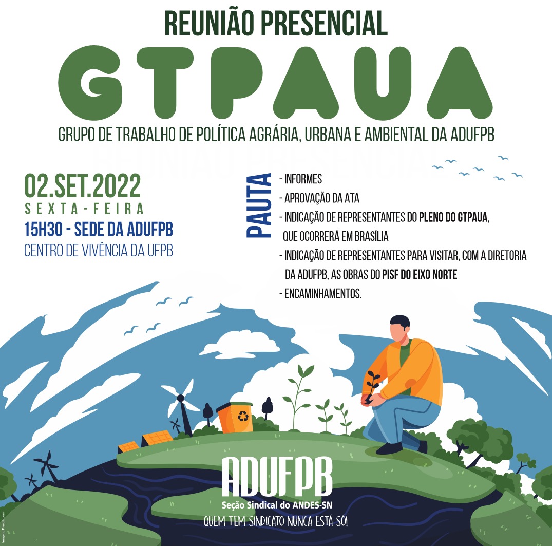 O Grupo de Trabalho de Política Agrária, Urbana e Ambiental (GTPAUA) da ADUFPB realiza na próxima sexta-feira (2/9) a primeira reunião presencial do biênio 2022/2024. A atividade será na sede do sindicato, localizada no Centro de Vivência do campus I, a partir das 15h30. Em pauta estão os seguintes assuntos: Informes, aprovação da ata, indicação de representantes do Pleno do GTPAUA, do Andes-SN, que ocorrerá em Brasília, indicação de representantes para visitar, com a diretoria da ADUFPB, as obras do Eixo Norte do Projeto de Integração do São Francisco (PIS) e encaminhamentos.