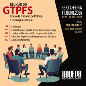 A reunião será realizada na Sala de Leitura da ADUFPB, no Centro de Vivência do campus I, a partir das 15h. Todos(as) os(as) docentes interessados(as) no tema política e formação sindical podem participar da reunião e contribuir com propostas para os debates