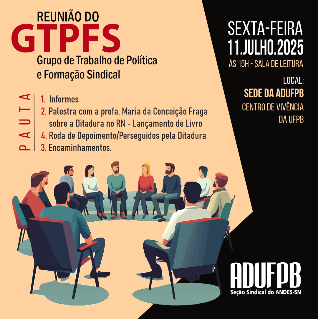 O Grupo de Trabalho de Política e Formação Sindical (GTPFS) da ADUFPB reúne-se na próxima sexta-feira (11/7) para tratar sobre os encaminhamentos propostos pelos GTs de política e formação sindical do ANDES, além de planejar a realização de uma palestra com a socióloga e historiadora Maria da Conceição Fraga, da UFRN, e o lançamento de um livro, de autoria da professora Maria da Conceição, sobre o período da ditadura militar no estado do Rio Grande do Norte.