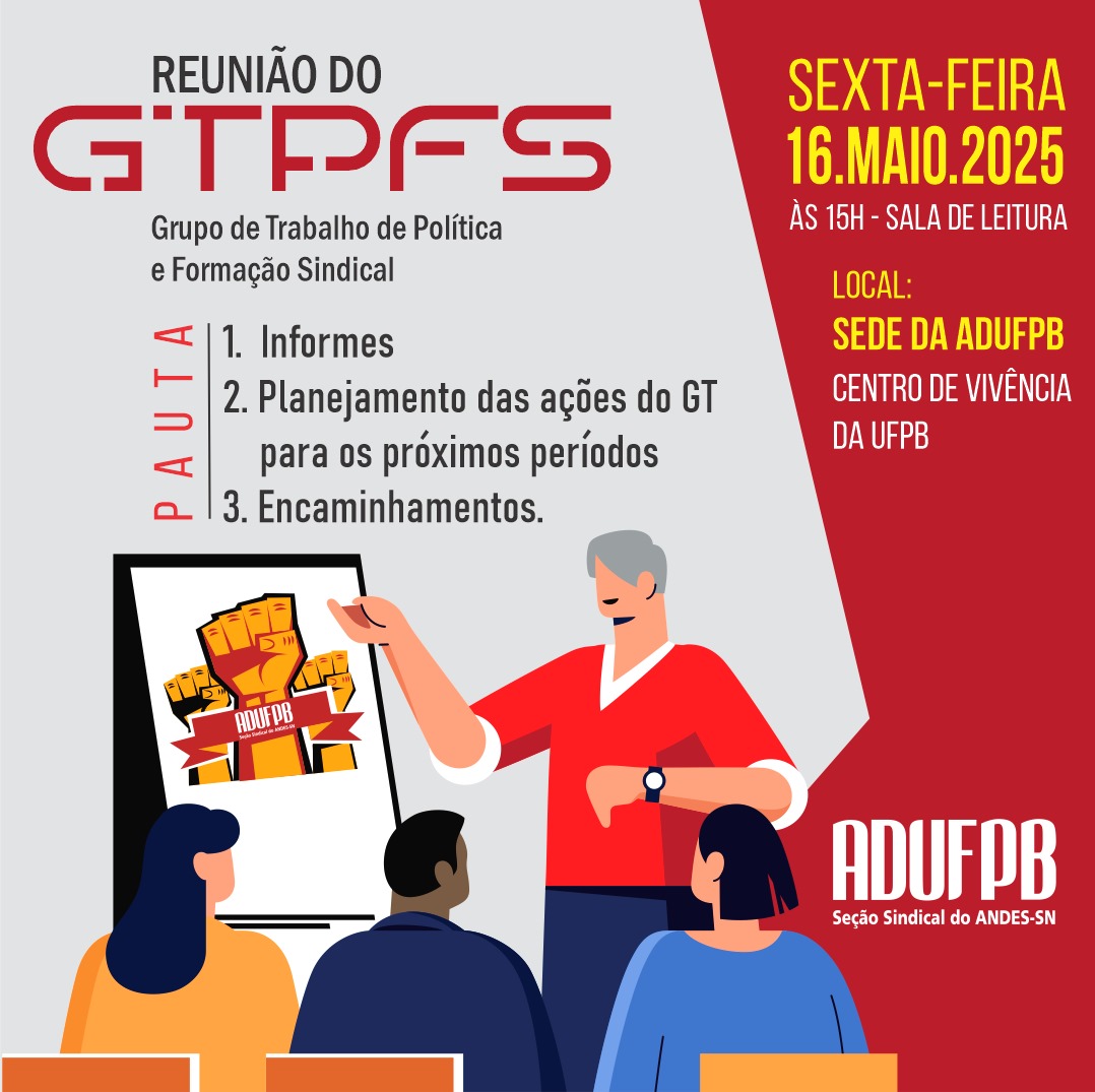 O Grupo de Trabalho de Política e Formação Sindical (GTPFS) da ADUFPB reúne-se na próxima sexta-feira (16) para tratar do planejamento das ações para os próximos períodos.
