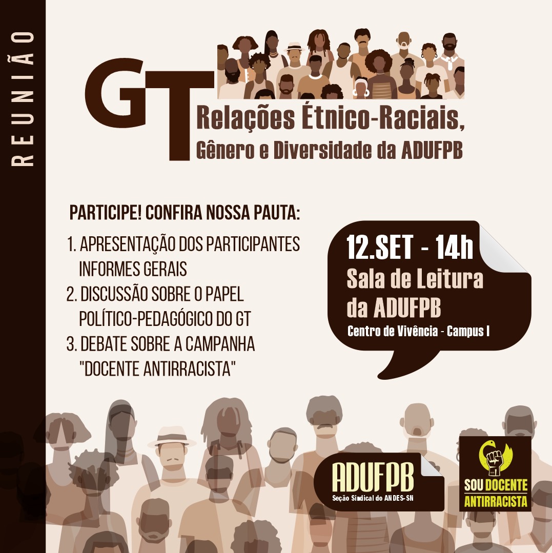 O Grupo de Trabalho (GT) Relações Étnico-Raciais, Gênero e Diversidade da ADUFPB convoca os(as) docentes para uma reunião que será realizada no dia 12 de setembro, às 14h, na Sala de Reunião da sede da ADUFPB.
