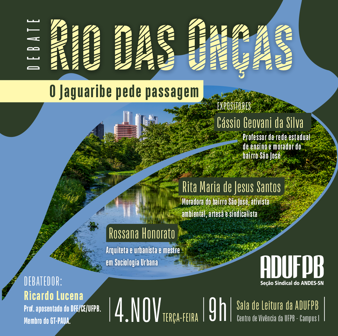 O Grupo de Trabalho de Política Agrária, Urbana e Ambiental (GTPAUA) da ADUFPB realiza, na próxima terça-feira, 4 de novembro, às 9h, o debate “Rio das Onças – O Jaguaribe pede passagem”, um encontro voltado à reflexão sobre as condições ambientais do rio Jaguaribe, sua importância histórica para João Pessoa e as medidas necessárias para conter a degradação de seu leito.
