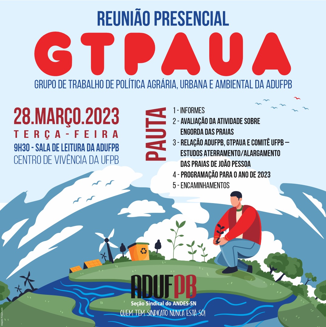 O Grupo de Trabalho de Política Agrária, Urbana e Ambiental (GTPAUA) da ADUFPB realiza, na próxima terça-feira (28), reunião na sede do sindicato, localizada no Centro de Vivência do campus I, a partir das 9h30. Em pauta estão os seguintes assuntos: 1 – Informes; 2 – Avaliação da atividade sobre engorda das praias; 3 – Relação Adufpb, GTPAUA e Comitê UFPB – Estudos Aterramento/Alargamento das Praias de João Pessoa; 4 – Programação para o ano de 2023; 5 – Encaminhamentos.