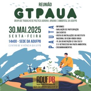 O Grupo de Trabalho de Política Agrária, Urbana e Ambiental (GTPAUA) da ADUFPB realiza, nesta sexta-feira, 30, mais uma reunião na sede do sindicato, localizada no Centro de Vivência do campus I, a partir das14h00. A reunião acontecerá na Sala de Leitura da ADUFPB.