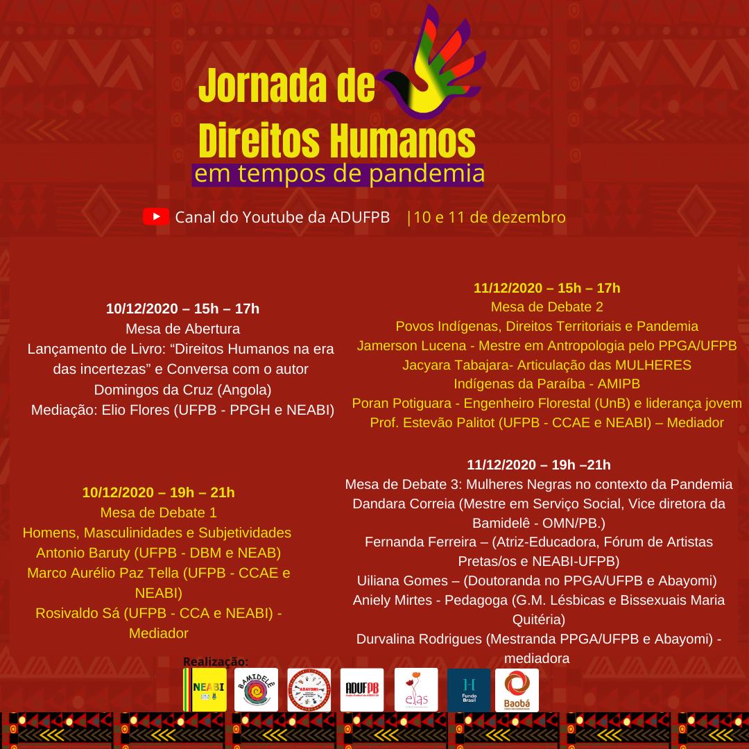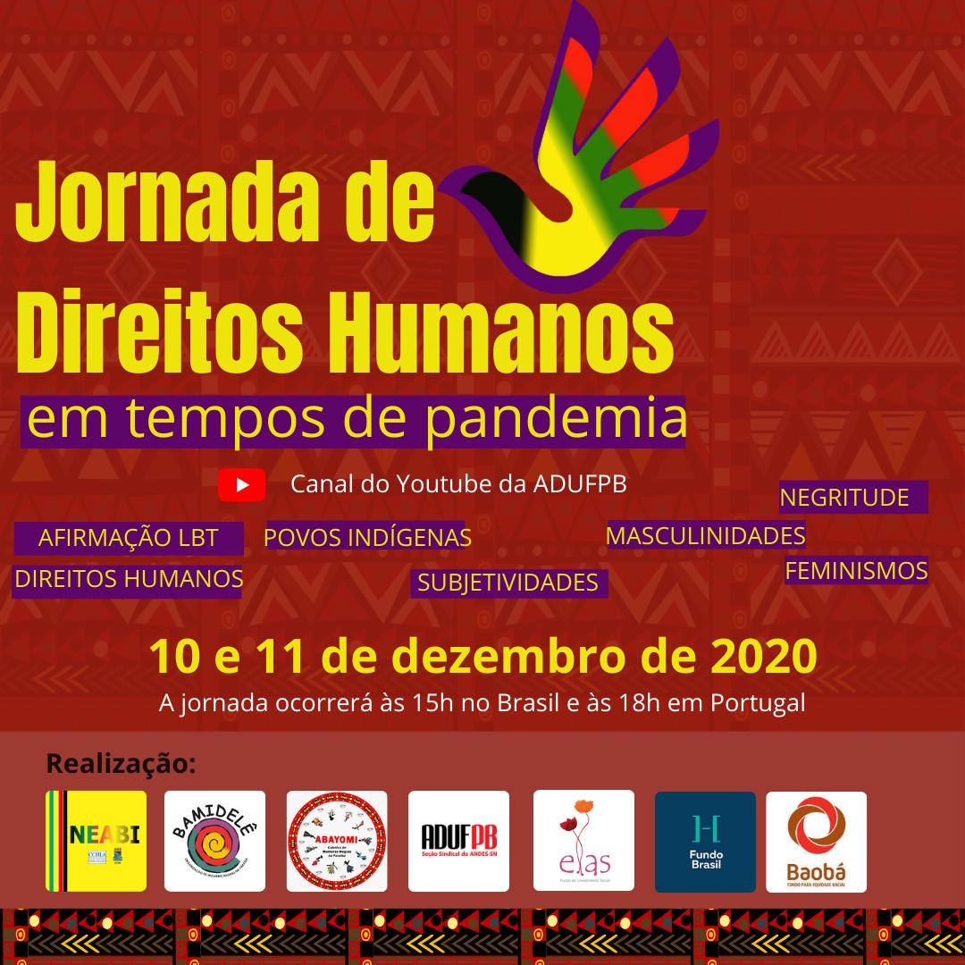 Começou nesta quinta-feira (10/12) a Jornada de Direitos Humanos – Em tempos de pandemia. O evento é on-line, com transmissão pelo canal da ADUFPB no YouTube.