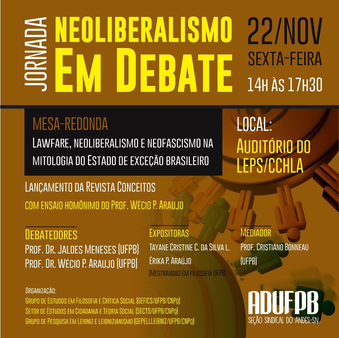 O neoliberalismo e seus efeitos sobre a política brasileira serão tema de debate na UFPB nos dias 22 de novembro e 6 de dezembro. As atividades vão ocorrer no auditório do LEPS/CCHLA e estão sendo organizadas pelo Grupo de Estudos em Filosofia e Crítica Social, pelo Setor de Estudos em Cidadania e Teoria Social e pelo Grupo de Pesquisa em Leibniz e leibnizianismo.