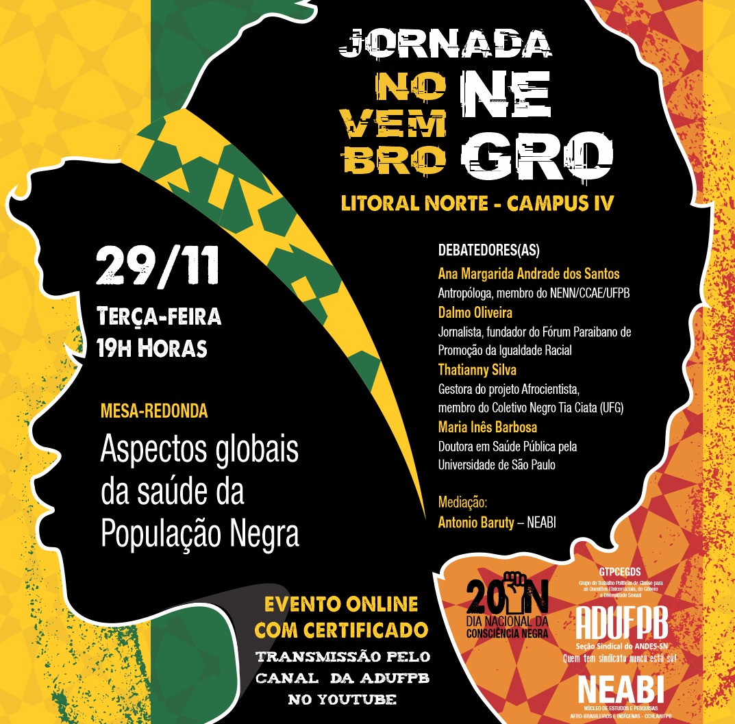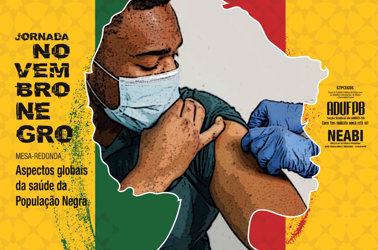 A terceira atividade da Jornada Novembro Negro, evento promovido pela ADUFPB e pelo Núcleo de Estudos Afro-Brasileiros e Indígenas (Neabi) da UFPB, ocorrerá nesta terça-feira (29), das 19h às 21h. O evento será on-line, com transmissão pelo Youtube da ADUFPB, e debaterá o tema “Aspectos globais da saúde da População Negra”. Os participantes da live no canal da ADUFPB no Youtube terão direito a certificado. Para isso, é necessário preencher um formulário (disponível aqui) e marcar presença no chat, com identificação por meio do nome e do lugar de origem.