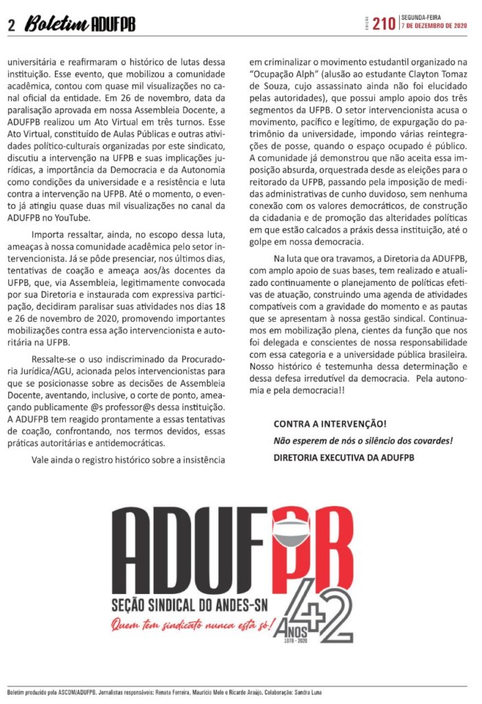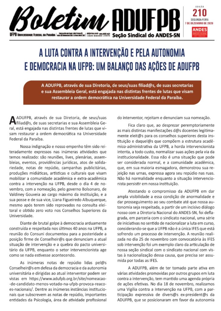 dez72020Clique aqui para baixar o novo boletim em formato PDF. 7 de dezembro de 2020 Compartilhar Compartilhar isto FacebookCompartilhar isto Facebook Share on XCompartilhar isto X Compartilhar isto WhatsAppCompartilhar isto WhatsApp Navegação de post:AnteriorPost anterior:NOTA DE PESAR – Jailson Terto da SilvaPróximoPróximo post:Colegiado do Departamento de Psicologia da UFPB repudia nomeação de reitor não eleito