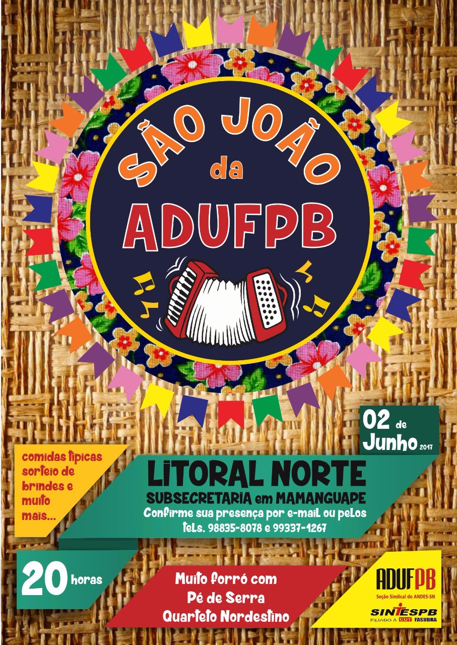 A subsecretaria da ADUFPB no campus Litoral Norte promove na próxima sexta-feira (2/6) uma festa para comemorar o período junino e promover um momento de lazer e confraternização entre os professores.