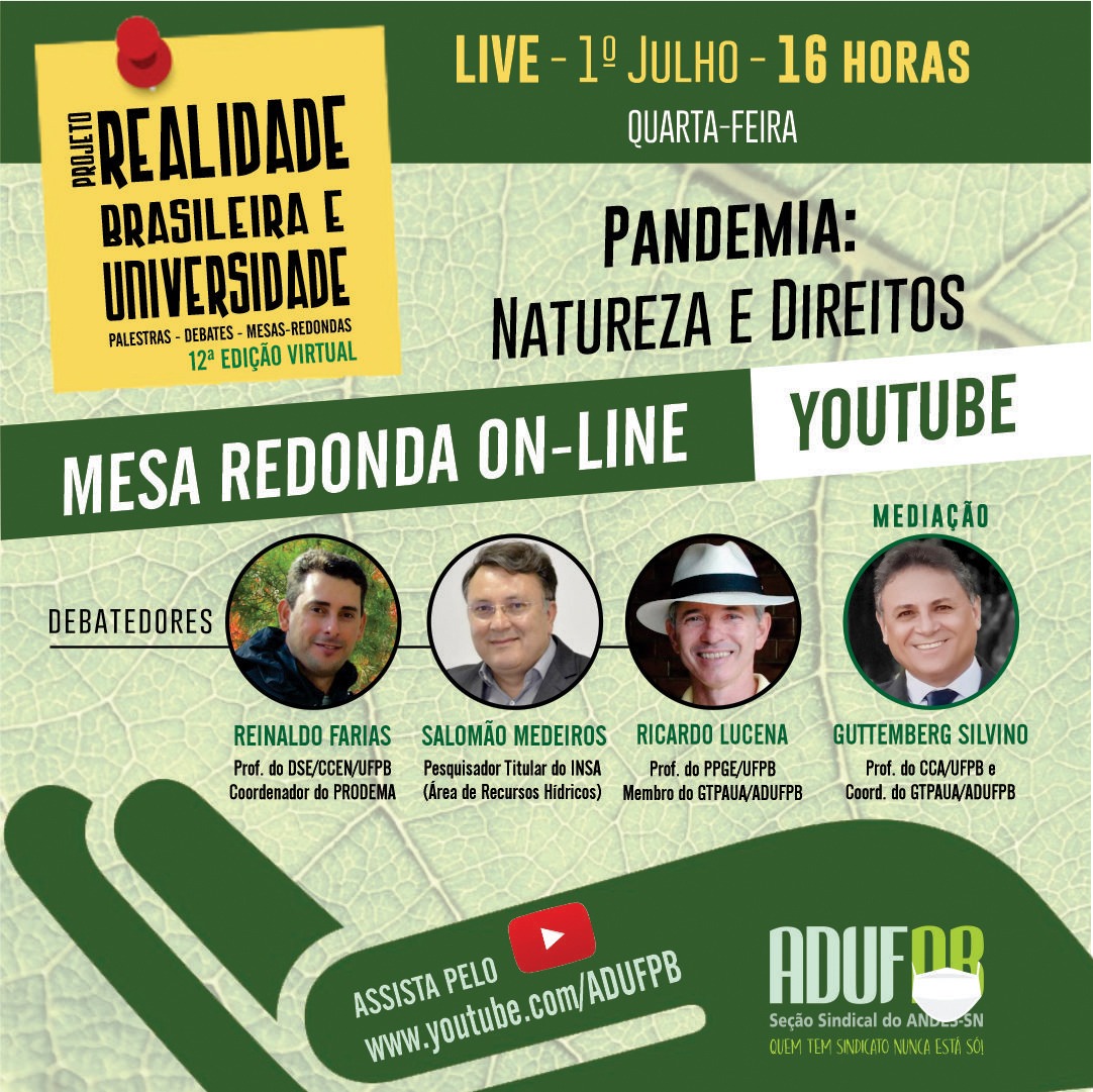 O desafio da preservação ambiental e a correlação entre os ataques à natureza e a pandemia do novo coronavírus serão o foco desta semana do projeto Realidade Brasileira de Universidade. Como vem ocorrendo desde o início das medidas de isolamento social, o evento será online, com transmissão pelo canal da ADUFPB no Youtube (www.youtube.com/ADUFPB).