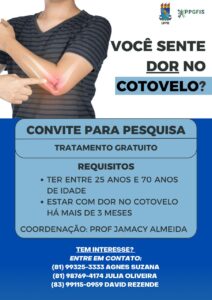 O programa de Mestrado em Fisioterapia da UFPB está desenvolvendo uma pesquisa com o objetivo de avaliar o tratamento da “epicondilite do cotovelo”, um processo doloroso que acomete pessoas que realizam atividade manual e que exige movimentos repetitivos do punho e antebraço, como jogar tênis, digitar, usar ferramentas manuais, cozinhar etc.