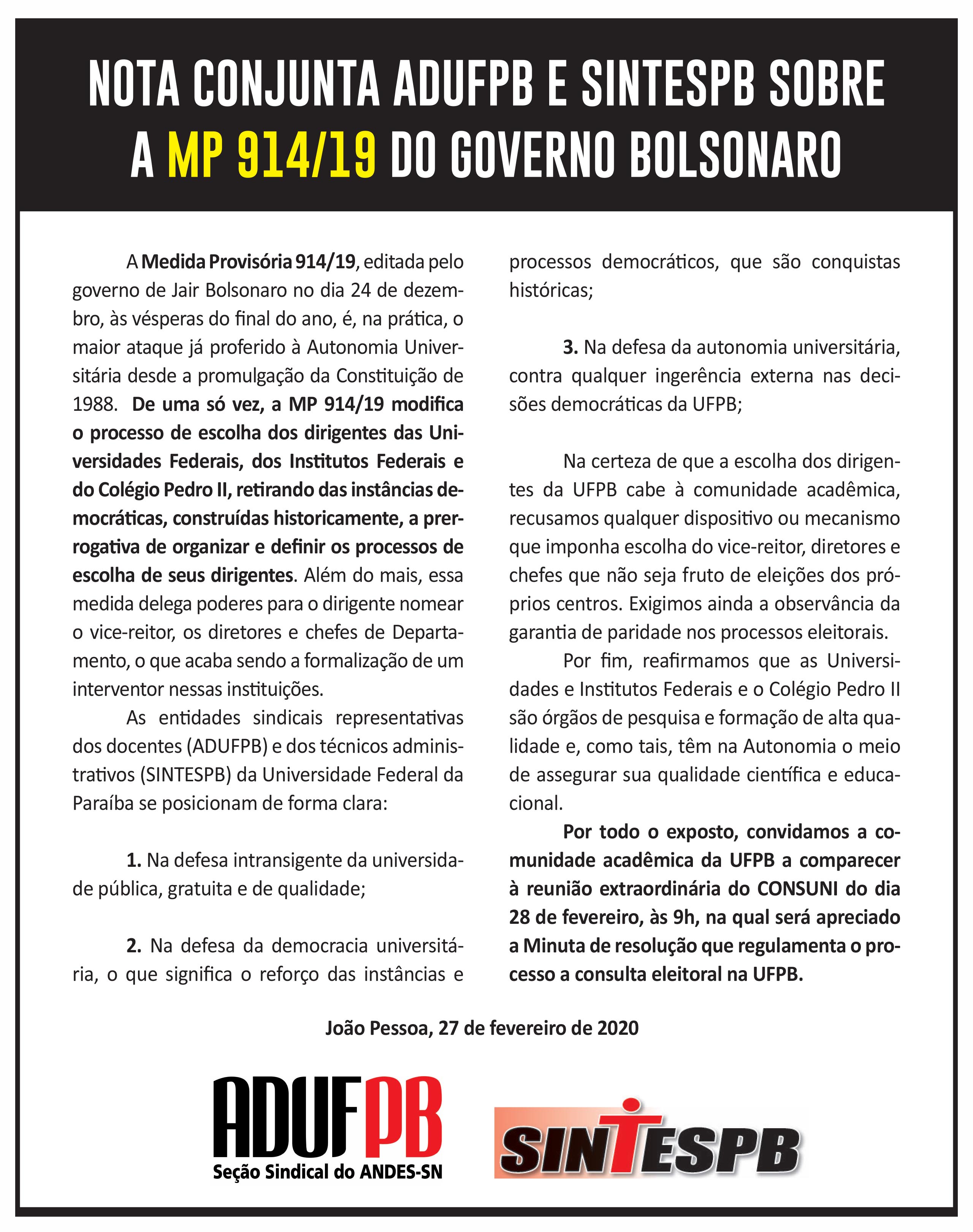 As entidades sindicais representativas dos docentes (ADUFPB) e dos técnicos administrativos (SINTESPB) da Universidade Federal da Paraíba se posicionam de forma clara: