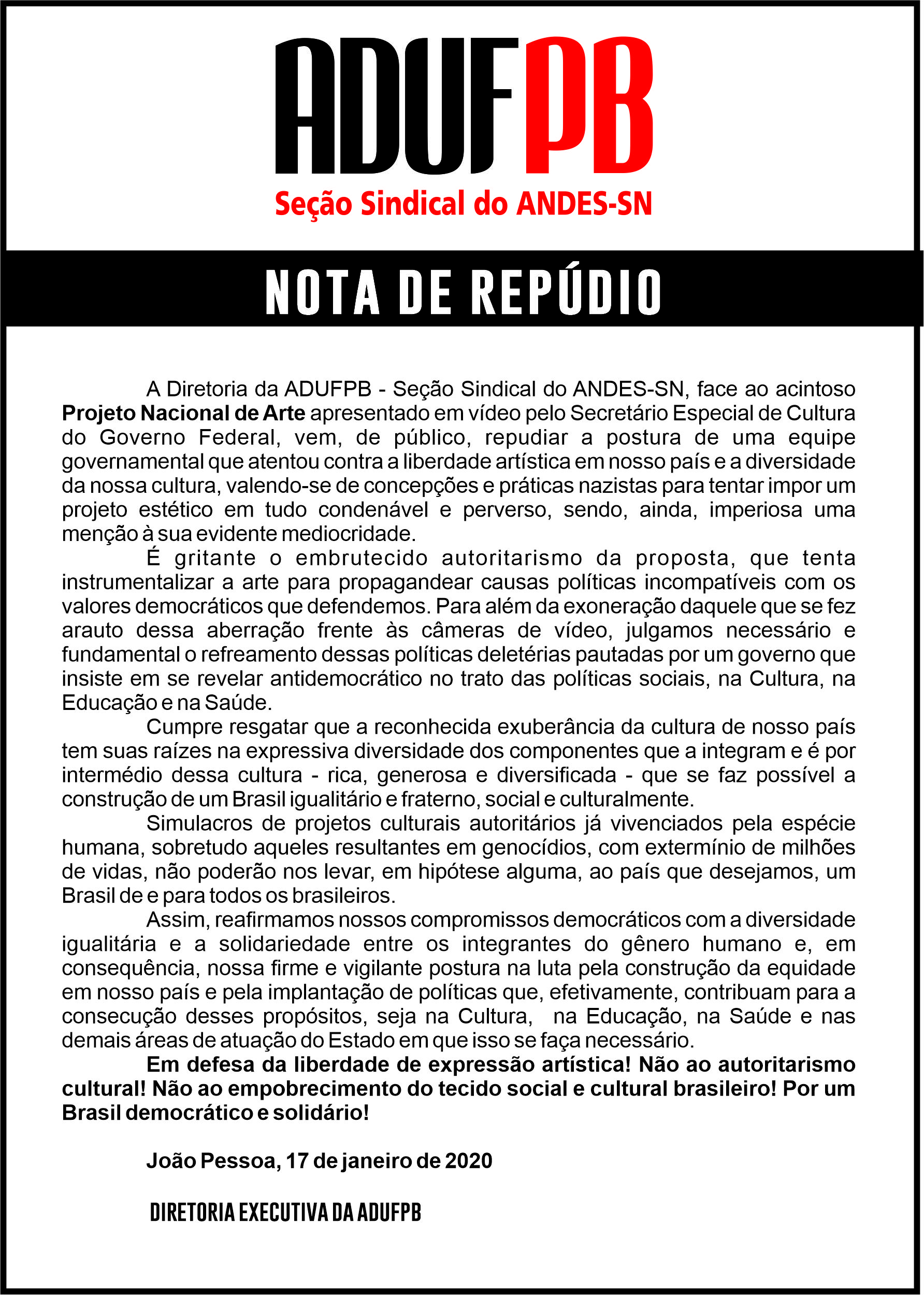 A Diretoria da ADUFPB, face ao acintoso Projeto Nacional de Arte apresentado em vídeo pelo Secretário Especial de Cultura do Governo Federal, vem, de público, repudiar a postura de uma equipe governamental que atentou contra a liberdade artística em nosso país e a diversidade da nossa cultura, valendo-se de concepções e práticas nazistas para tentar impor um projeto estético em tudo condenável e perverso, sendo, ainda, imperiosa uma menção à sua evidente mediocridade.É gritante o embrutecido autoritarismo da proposta, que tenta instrumentalizar a arte para propagandear causas políticas incompatíveis com os valores democráticos que defendemos.