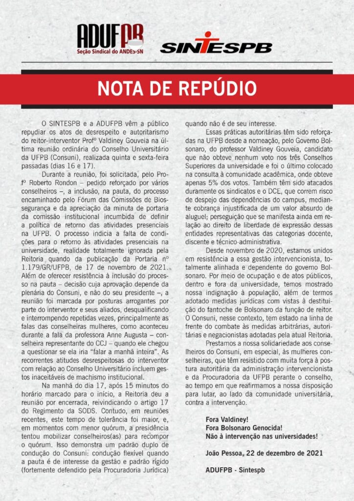 Essas práticas autoritárias têm sido reforçadas na UFPB desde a nomeação, pelo Governo Bolsonaro, do professor Valdiney Gouveia, candidato que não obteve nenhum voto nos três Conselhos Superiores da universidade e foi o último colocado na consulta à comunidade acadêmica, onde obteve apenas 5% dos votos. Também têm sido atacados duramente os sindicatos e o DCE, que correm risco de despejo das dependências do campus, mediante cobrança injustificada de um valor absurdo de aluguel; perseguição que se manifesta ainda em relação ao direito de liberdade de expressão dessas entidades representativas das categorias docente, discente e técnico-administrativa.
