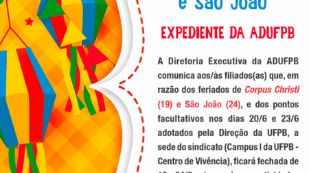 Sede da ADUFPB estará fechada durante feriadão de Corpus Christi (19/6) e de São João (24/6). Atividades retornam dia 25/6 (quarta-feira) 16 de junho de 2025
