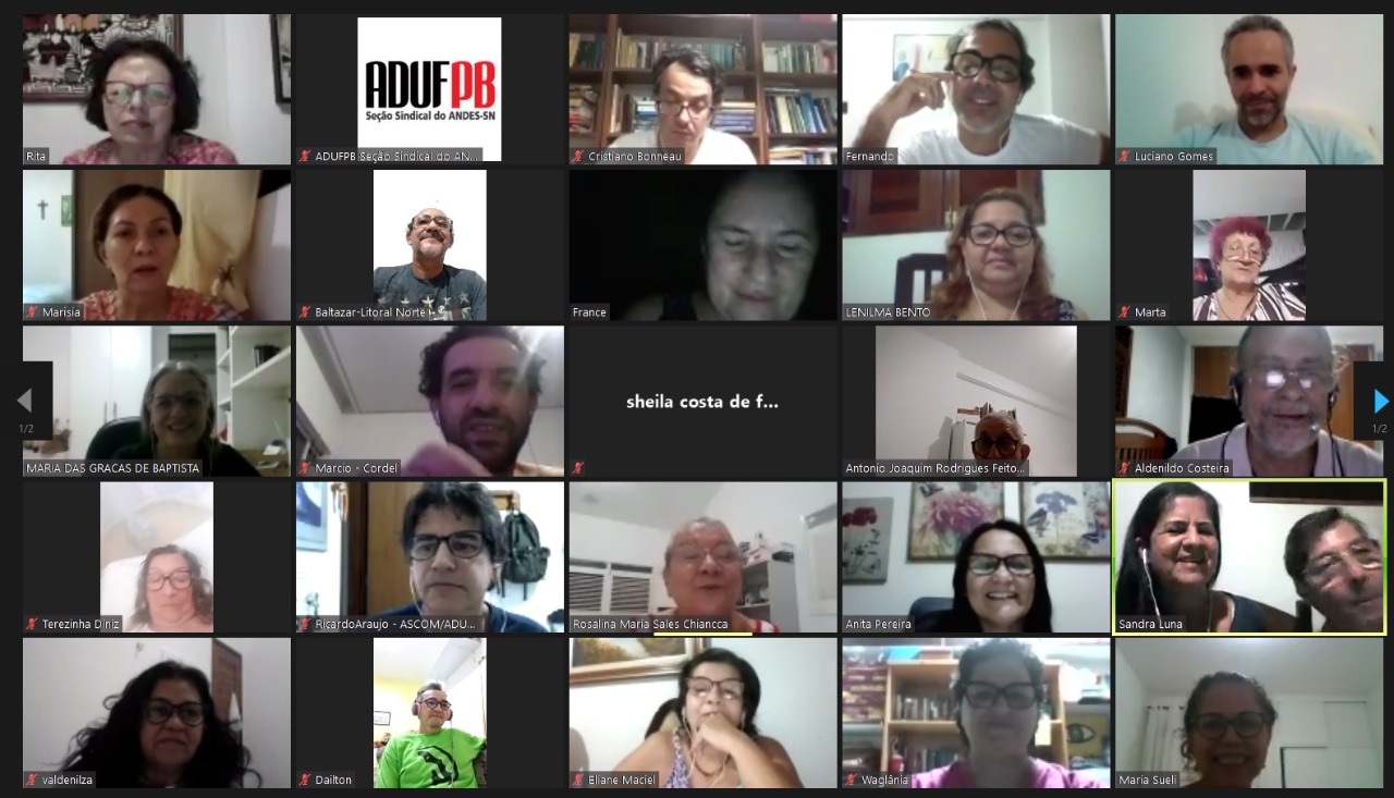 A ADUFPB realizou na última quinta-feira (26) uma plenária docente para discutir a proposta de calendário extraordinário na UFPB e a participação da categoria na campanha nacional Fora Bolsonaro. A atividade ocorreu por videoconferência – devido às medidas de isolamento social decorrentes da pandemia de covid-19 – e reuniu cerca de 60 professores e professoras.