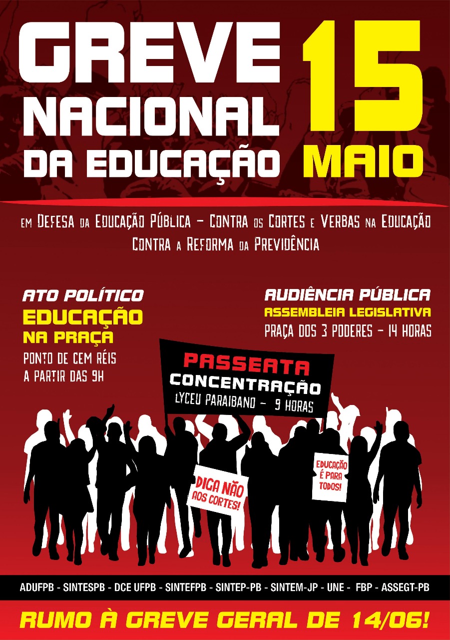 Um grande ato público será realizado em João Pessoa na próxima quarta-feira, 15 de maio, em defesa da educação pública e contra a reforma da Previdência. A atividade integra o Dia de Greve Nacional da Educação, convocado por entidades representantivas de todo o país.