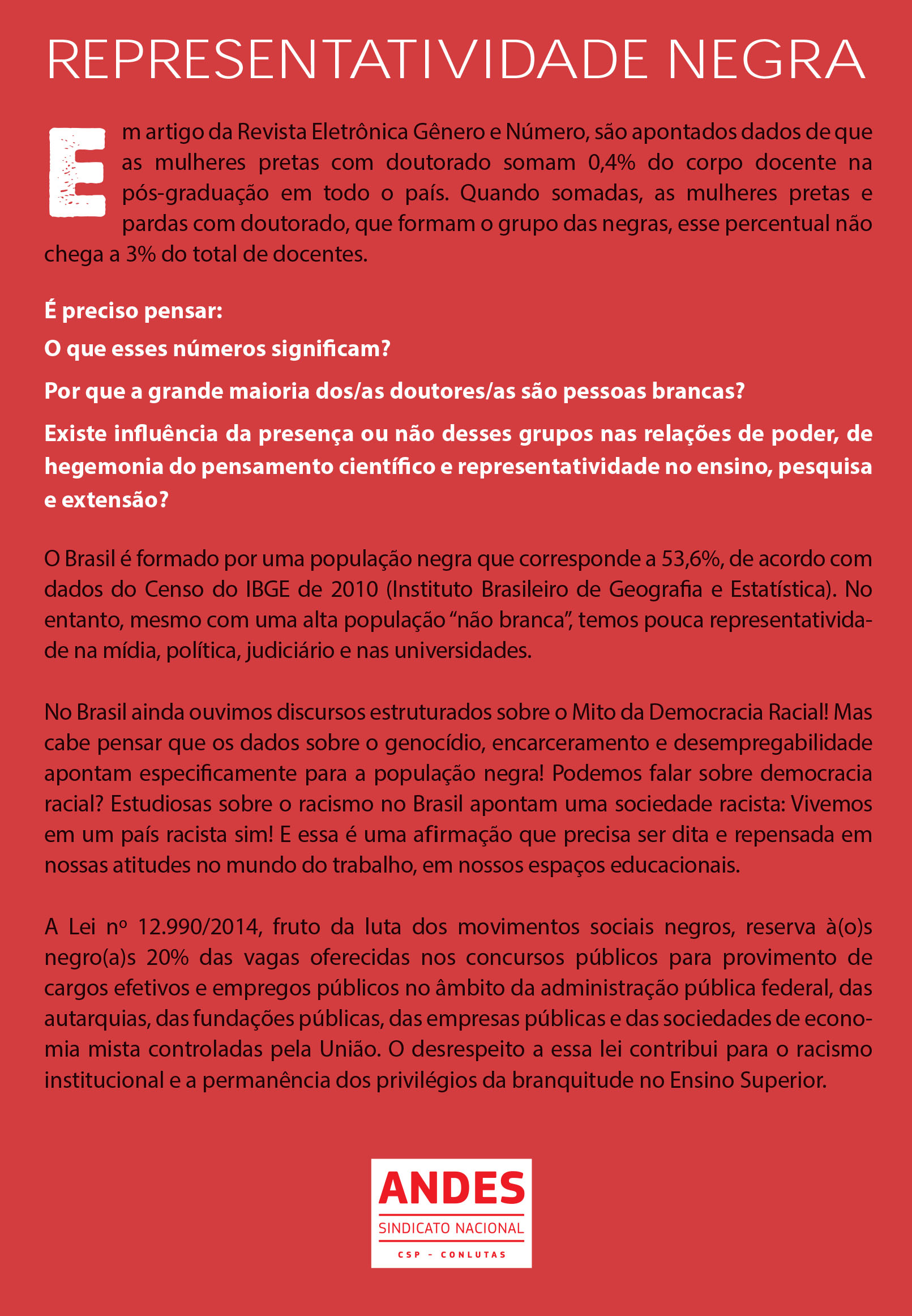 Ainda, neste ano de 2018, a Revista Universidade e Sociedade trouxe uma edição especial “130 anos da Abolição da Escravidão no Brasil: Resistência do Povo Negro e a Luta por Reparações”, que buscou através de textos, fotos e poesias, refletir sobre as lutas do povo negro e a necessidade de reparações nestes 130 anos da abolição da escravatura no país. Estes materiais devem ser divulgados e as atividades de formação realizadas por meio deles, para que possam provocar a nossa base sindical a repensar a face do racismo na estrutura institucional e nas práticas cotidianas.