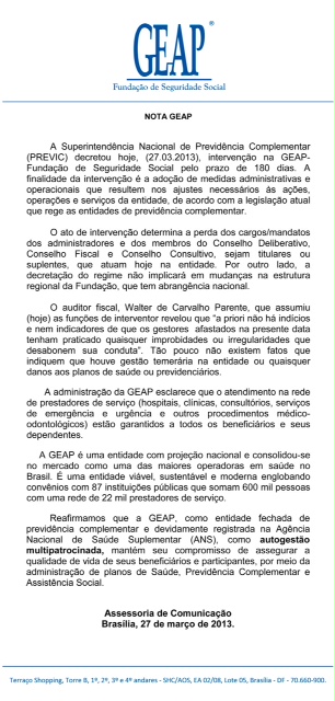 A Superintendência Nacional de Previdência Complementar (Previc) decretou no último dia 27 intervenção na Geap – Fundação de Seguridade Socia pelo prazo de 180 dias para quem sejam adotadas medidas administrativas e operacionais que resultem nos ajustes necessários às ações, operações e serviços da entidade. Veja abaixo nota oficial da Geap sobre a intervenção (para ampliar, basta clicar na imagem).