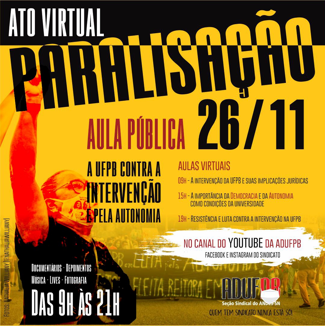 Os professores da UFPB realizam nesta quinta-feira (26/11) um dia de paralisação contra a intervenção e em defesa da autonomia universitária. Como estratégia de mobilização e conscientização, será realizada uma grande aula pública virtual, com transmissão pelo canal da ADUFPB no YouTube (www.youtube.com/ADUFPB).