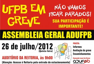 Os professores da UFPB, em greve há mais de dois meses, realizam na próxima quinta-feira (26/7), às 9h, a sétima assembleia geral após o início do movimento, no dia 17 de maio.
