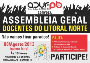 Os professores do campus IV da UFPB (Litoral Norte) realizam nesta quinta-feira (8/8) uma nova assembleia geral para voltar a discutir a greve dos estudantes iniciada no dia 9 de julho. A reunião está marcada para começar às 19h, no auditório da unidade de Mamanguape. A pauta consta dos seguintes pontos: Política de Permanência Estudantil aos alunos da Universidade Federal da Paraíba e avaliação do movimento docente no campus IV – relatório da Comissão Docente.