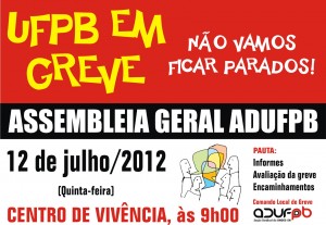 O Comando Local de Greve dos professores da UFPB realiza nesta quinta-feira (12/7) a quinta assembleia desde o início da paralisação geral das atividades, no dia 17 de maio. A reunião acontecerá no Centro de Vivência do Campus I, a partir das 9h.