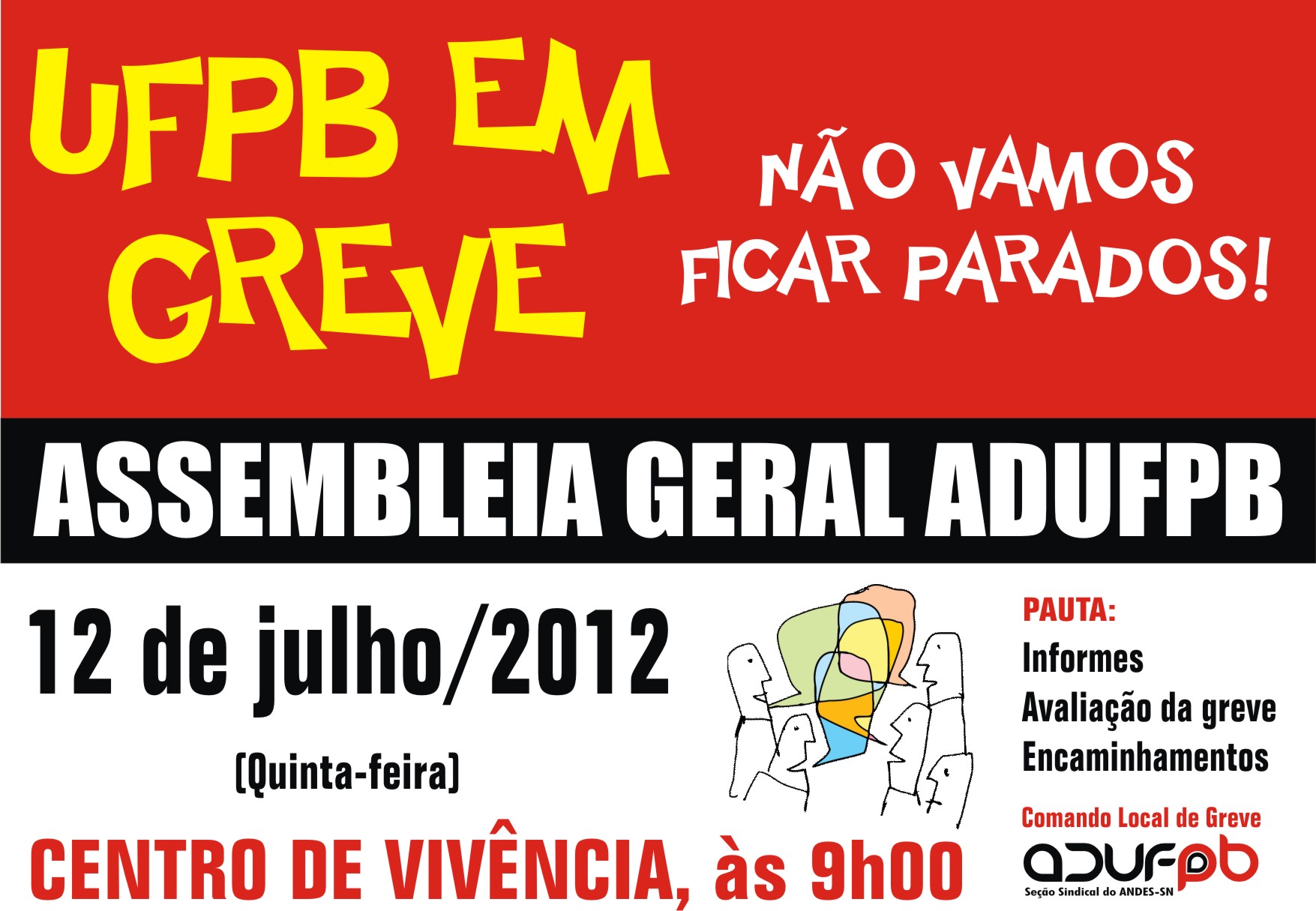 9h00 – Assembleia geral – Local: Centro de Vivência – Pauta: 1) informes; 2) avaliação da greve; 3) encaminhamentos.