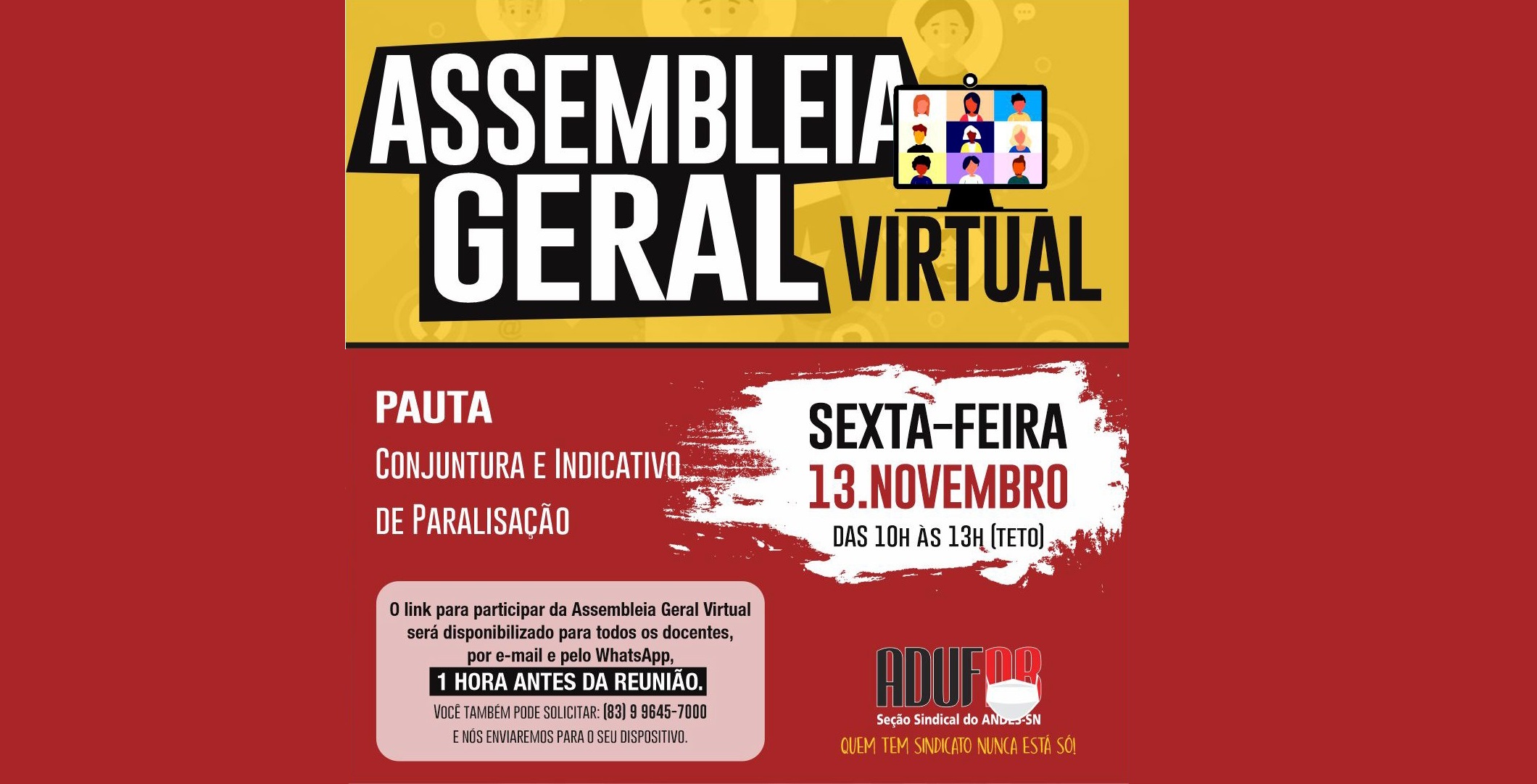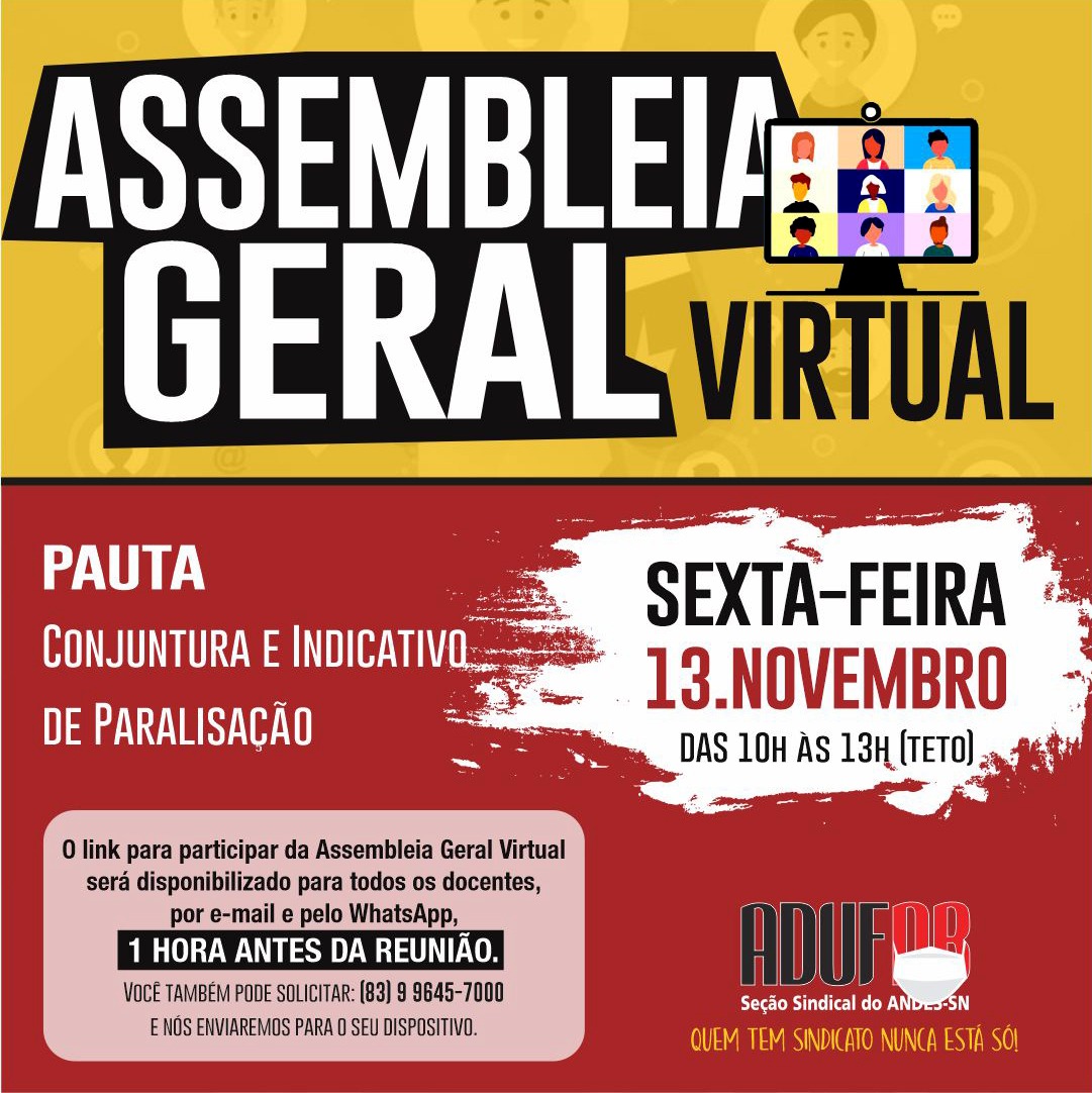A assembleia ocorrerá por meio da plataforma de videoconferência Zoom e o link será distribuído uma hora antes do início da atividade pelo e-mail adufpb@terra.com.br e pelo Whatsapp 99645-7000.