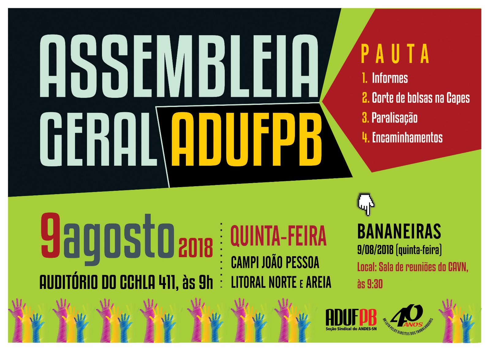 A ADUFPB promove nova assembleia docente nesta quinta-feira, dia 9 de agosto. Em João Pessoa, a atividade será no auditório 411 do CCHLA, a partir das 9h, e reunirá também os docentes dos campi Litoral Norte e Areia. Já em Bananeiras, a assembleia está marcada para 9h30 e será realizada na sala de reuniões do CAVN.