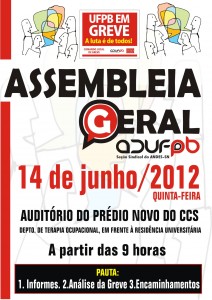 Os professores da UFPB reúnem-se nesta quinta-feira (14/6) durante a segunda assembleia geral realizada desde o início da greve da categoria, no dia 17 de maio. A assembleia ocorrerá no auditório do novo prédio do CCS (Departamento de Terapia Ocupacional, em frente à Residência Universitária) a partir das 9h. Na pauta estão informes, análise da greve e encaminhamentos.