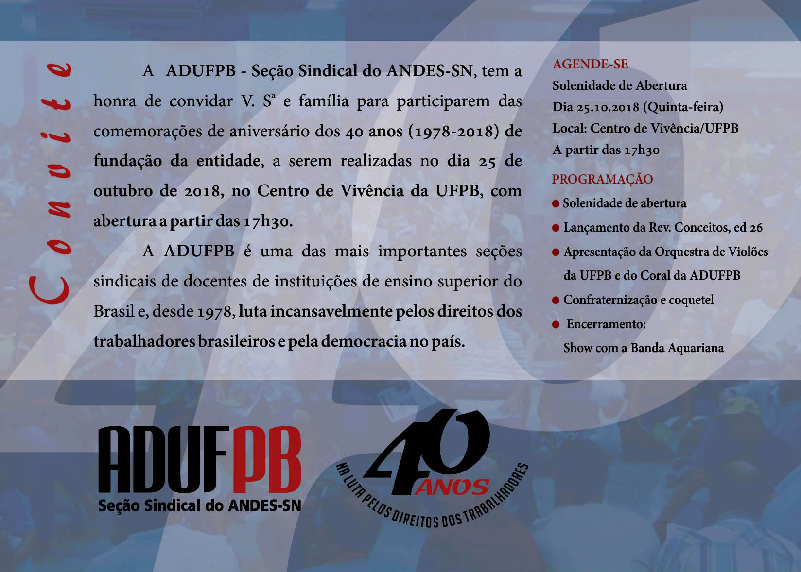 Quatro décadas de luta em defesa dos direitos da categoria docente. Nesta quinta-feira, 25 de outubro, a ADUFPB completa 40 anos. E, para comemorar a data, a entidade promove, até o dia 1º de novembro, uma série de atividades culturais e de lazer no Centro de Vivência do campus I, em João Pessoa.