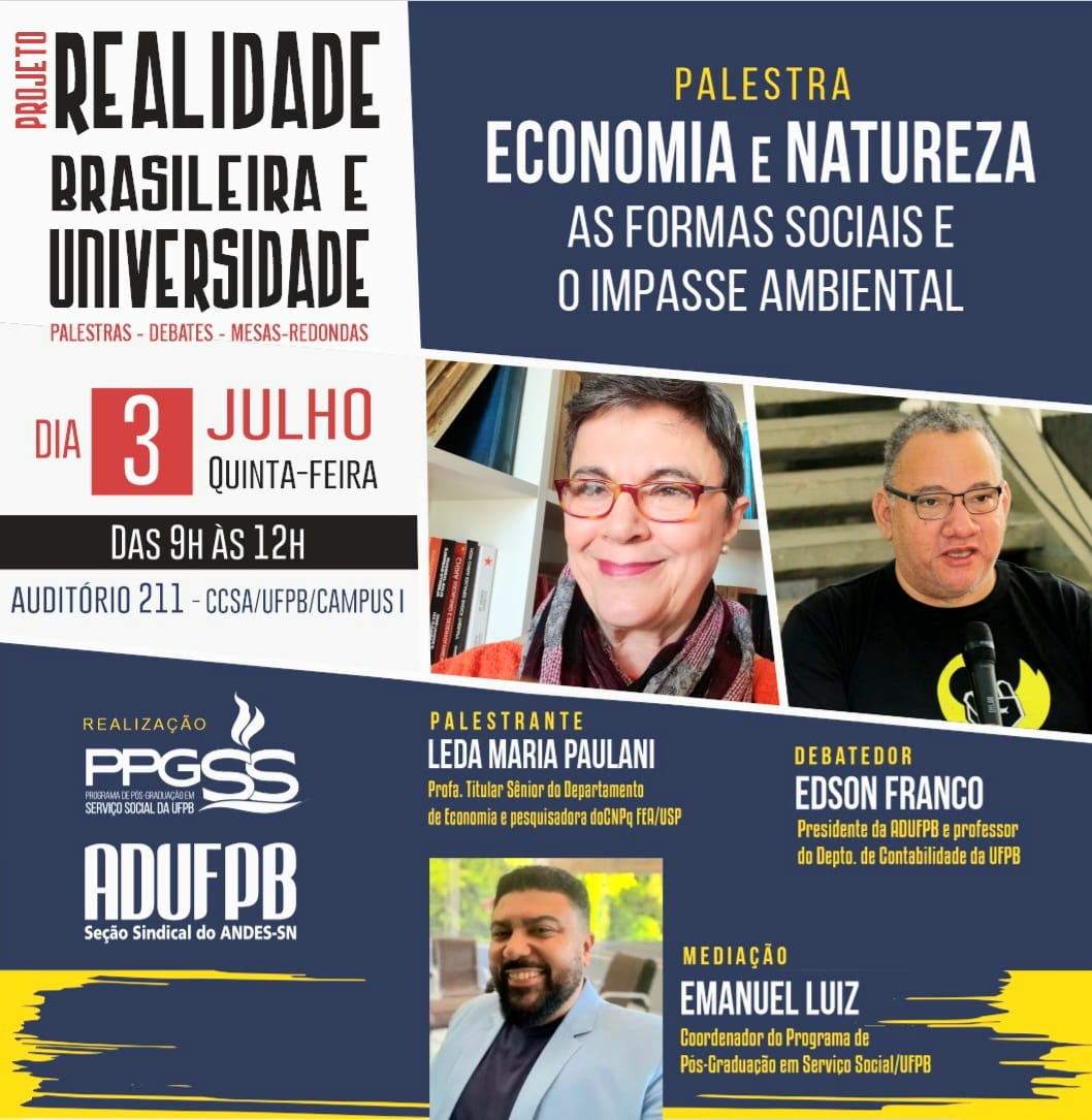 A ADUFPB realiza nesta quinta-feira (3), em parceria com o Programa de Pós-Graduação em Serviço Social (PPGSS) da Universidade Federal da Paraíba, mais uma edição do projeto Realidade Brasileira e Universidade. O evento será realizado no auditório 211 do Centro de Ciências Sociais Aplicadas (CCSA), das 9h às 12h.