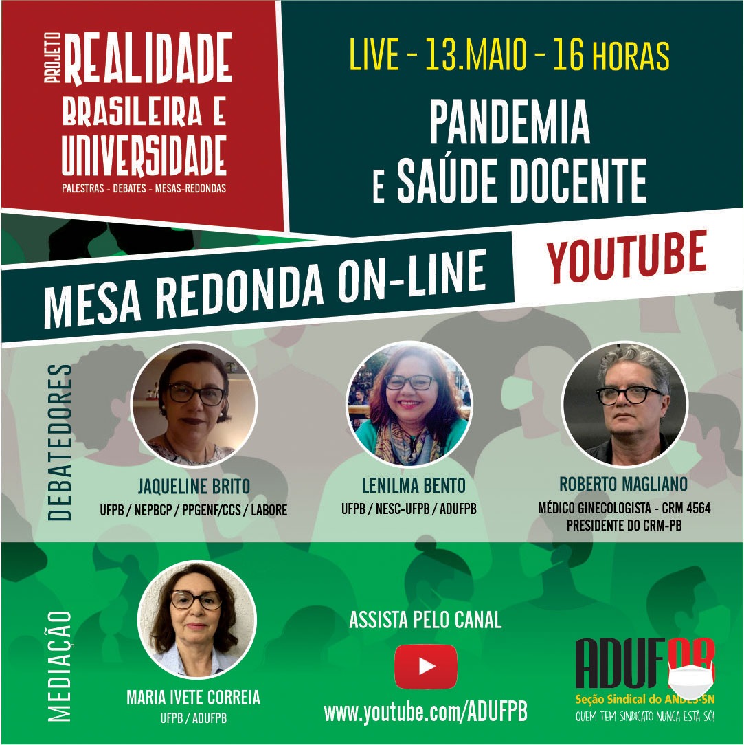 “Pandemia e saúde docente” será o tema da próxima live do projeto Realidade Brasileira e Universidade, organizado pela ADUFPB. A atividade ocorrerá na próxima quarta-feira (13/5), às 16h, e será transmitida pelo YouTube. Os internautas vão poder interagir, comentar e fazer perguntas aos palestrantes por meio do chat da plataforma.
