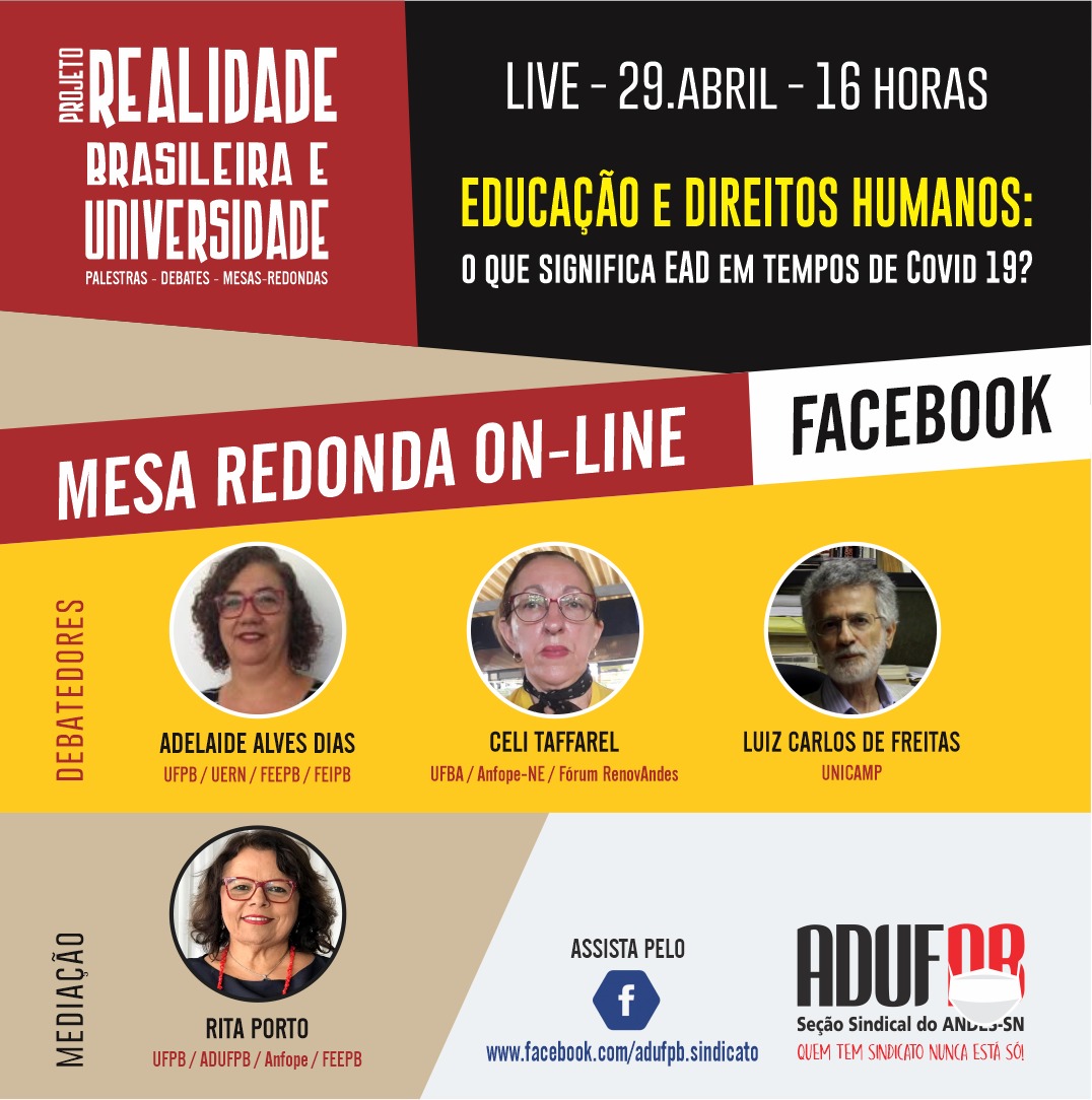 Com o tema “Educação e Direitos Humanos: O que significa EAD em tempos de Covid-19?”, o evento contará com a presença das professoras Adelaide Alves Dias (UFPB/UERN/FEEPB/FEIPB) e Celi Taffarel (UFBA/Anfope-NE/Fórum RenovAndes) e do professor Luiz Carlos de Freitas (Unicamp). A mediação ficará por conta da professora Rita Porto (UFPB/ADUFPB/Anfope/FEEPB).