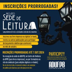 Foram prorrogadas até a próxima segunda-feira (7) as inscrições para o projeto Sede de Leitura, evento cultural promovido pela ADUFPB que proporciona o lançamento coletivo de livros impressos, e-books, revistas e outras publicações (impressas ou digitais) de autoria de professores(as) sindicalizados(as), dos quatro campi da UFPB, numa festa consagrada pela interação literária entre autores, autoras e convidados. O prazo inicialmente havia se encerrado no dia 30 de setembro.