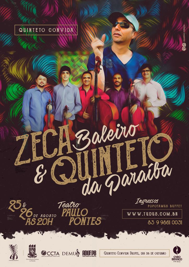 No próximo mês de agosto, o projeto “Quinteto Convida” apresentará show com o cantor e compositor Zeca Baleiro, comemorando 20 anos de carreira fonográfica. O evento acontecerá no Teatro Paulo Pontes nos dias 25 e 26 de agosto, sempre às 20h, e contará com o apoio da ADUFPB.