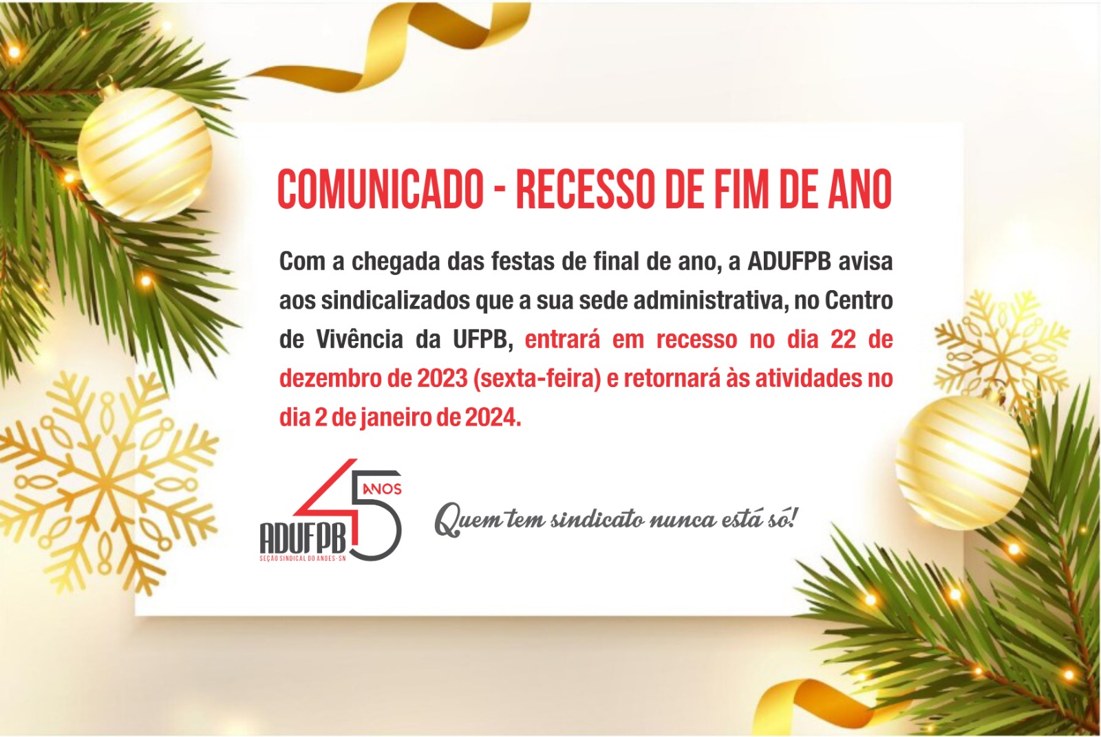 A ADUFPB vai dar uma parada nas suas atividades neste fim de ano. O recesso da sede administrativa, em João Pessoa, começa na sexta-feira, dia 22 de dezembro, e os trabalhos serão retomados no dia 2 de janeiro.