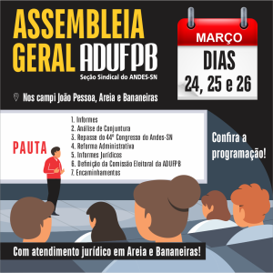 A ADUFPB convoca toda a categoria para uma nova rodada de assembleias na próxima semana. Os encontros serão realizados nos dias 24, 25 e 26, respectivamente nos campi de Bananeiras, João Pessoa e Areia.
