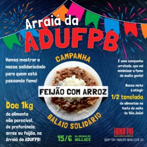 “Decidimos aproveitar a volta da festa de São João da ADUFPB para criar o ‘Balaio Solidário – Feijão com Arroz’. A ideia é estimular a doação principalmente desses dois produtos, tão tradicionais nos lares brasileiros, que, juntos, formam uma rica fonte de nutrientes. Quem quiser, pode doar outros produtos, mas queremos destacar esses dois”, explica Fernando Cunha. A doação pode ser entregue no dia da festa ou antes, na secretaria da ADUFPB, no Centro de Vivência do campus I, no momento em que a pessoa for confirmar o nome na lista de convidados.