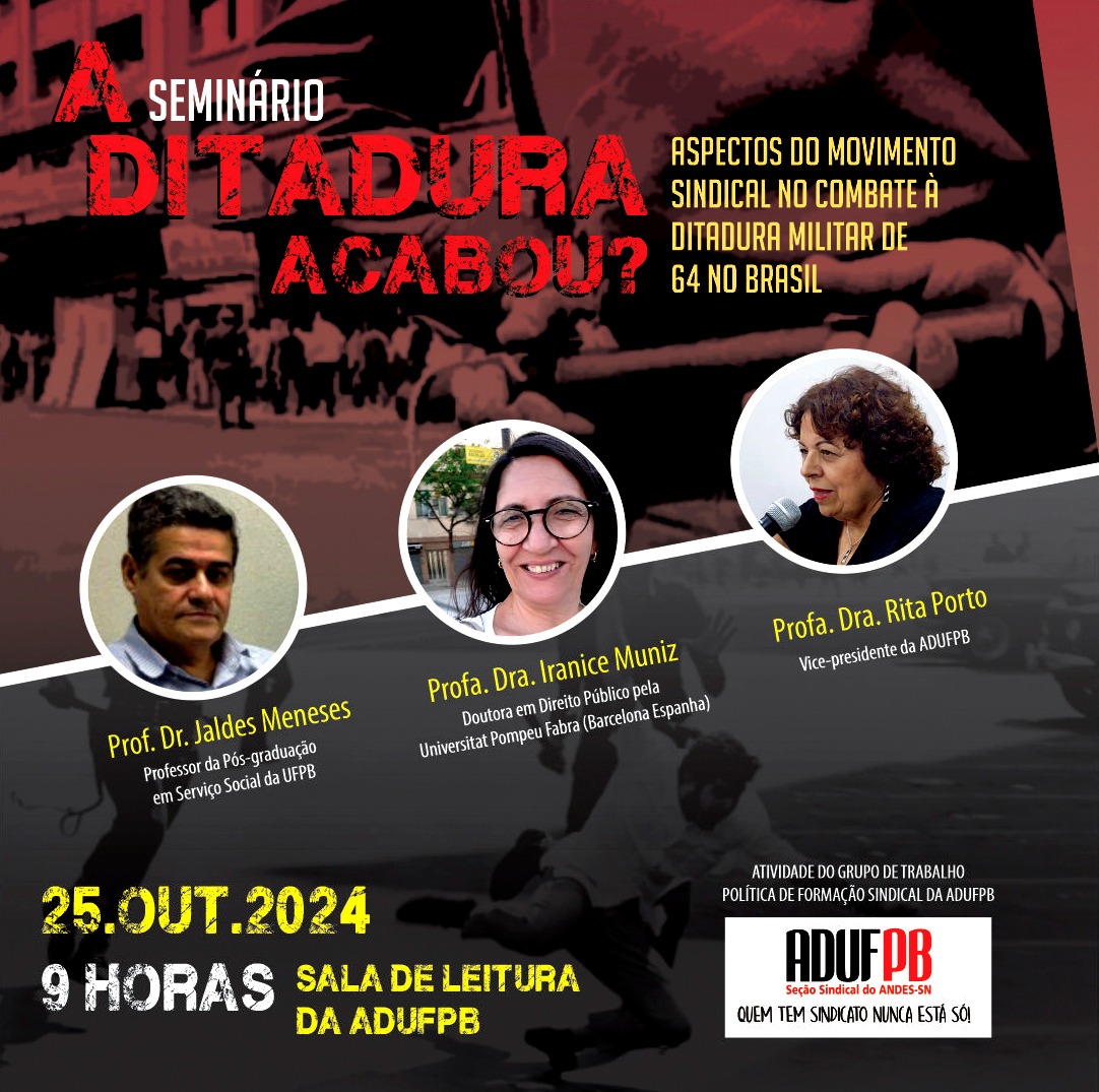O Grupo de Trabalho Política de Formação Sindical da ADUFPB (GTPFS) realiza no próximo dia 25 o seminário “A Ditadura acabou?”, sobre os 60 anos da Ditadura Civil Militar no Brasil, com foco no papel do movimento sindical na luta contra o regime instaurado em 1964. O evento integra a programação comemorativa dos 46 anos de fundação da ADUFPB e ocorrerá na Sala de Leitura da sede do sindicato, no Centro de Vivência do campus I.