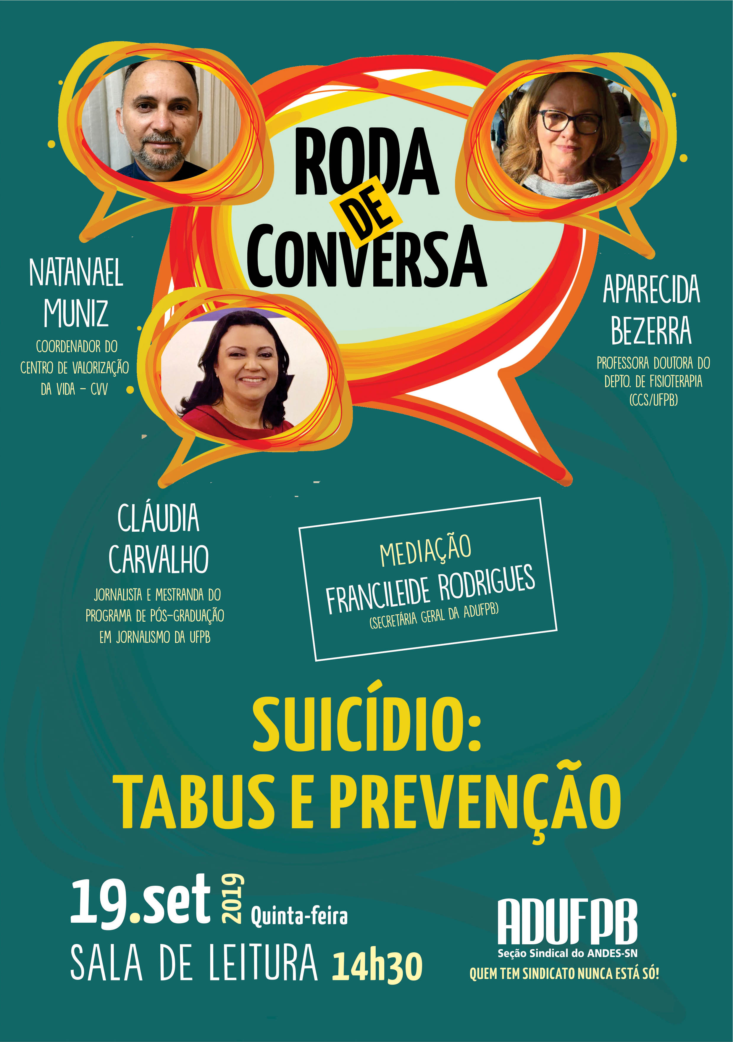 Para tratar sobre o tema, a ADUFPB convidou para esta primeira Roda de Conversa o coordenador do Centro de Valorização da Vida (CVV) da capital, Natanael Muniz; a professora Aparecida Bezerra, do curso de Fisioterapia da UFPB, e a jornalista Cláudia Carvalho, que desenvolve pesquisa no Programa de Pós-graduação em Jornalismo sobre o tema e sua relação com o noticiário impresso paraibano. O debate será mediado pela professora Francileide Rodrigues, secretária geral da ADUFPB.