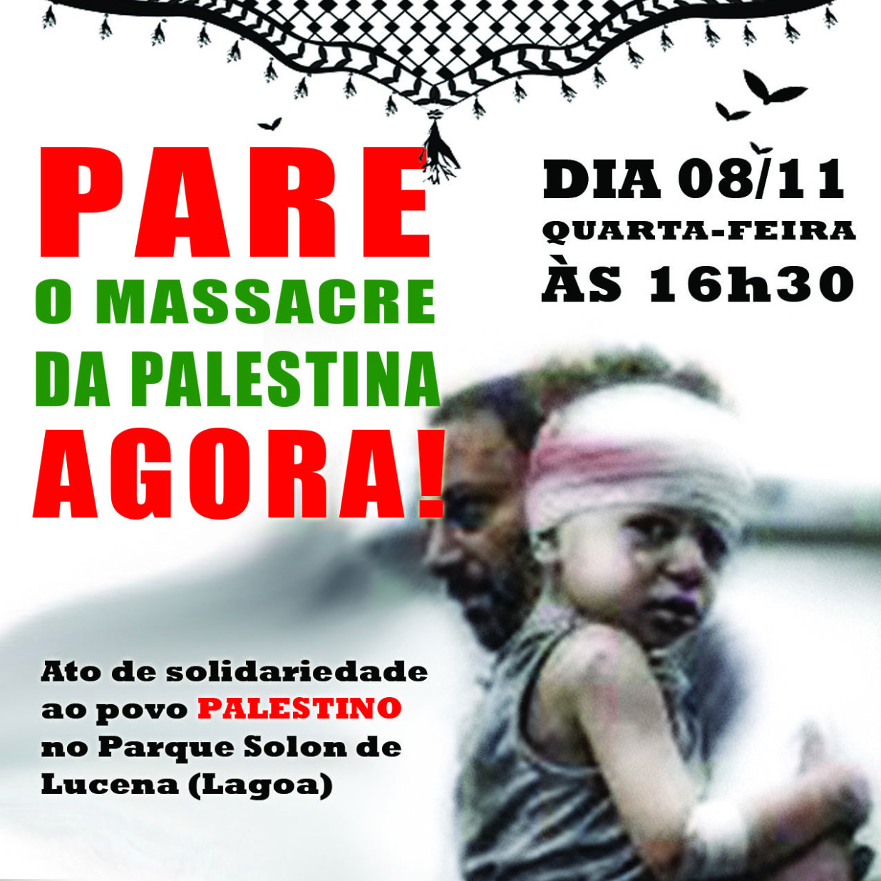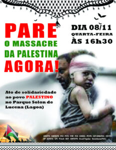 Nesta quarta-feira (8), acontecerá um ato público em solidariedade ao povo palestino, no Parque Solon de Lucena (Lagoa), às 16h30. A iniciativa conta com apoio da ADUFPB e de várias outras entidades.