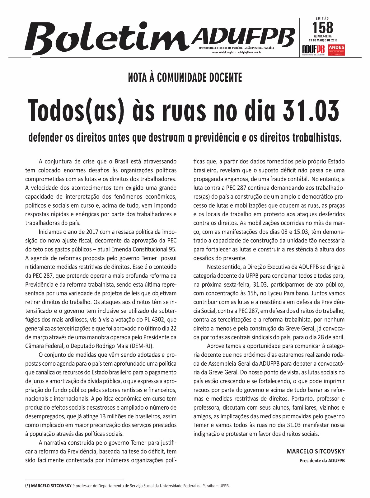 Neste sentido, a Direção Executiva da ADUFPB se dirige à categoria docente da UFPB para conclamar todos e todas para, na próxima sexta-feira, 31.03, participarmos de ato público, com concentração às 15h, no Lyceu Paraibano. Juntos vamos contribuir com as lutas e a resistência em defesa da Previdência Social, contra a PEC 287, em defesa dos direitos do trabalho, contra as terceirizações e a reforma trabalhista, por nenhum direito a menos e pela construção da Greve Geral, já convocada por todas as centrais sindicais do país, para o dia 28 de abril.