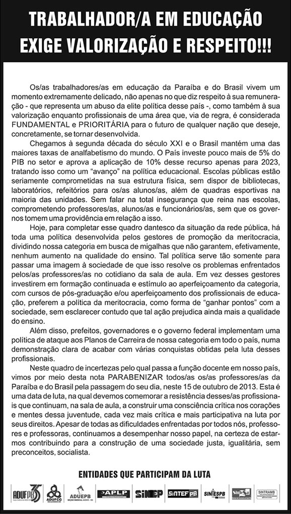 Neste quadro de incertezas pelo qual passa a função docente em nosso país, vimos por meio desta nota PARABENIZAR todos/as os/as professores/as da Paraíba e do Brasil pela passagem do seu dia, neste 15 de outubro de 2013. Esta é uma data de luta, na qual devemos comemorar a resistência desses/as profissionais que continuam, na sala de aula, a construir uma consciência crítica nos corações e mentes dessa juventude, cada vez mais crítica e mais participativa na luta por seus direitos. Apesar de todas as dificuldades enfrentadas por todos nós, professores e professoras, continuamos a desempenhar nosso papel, na certeza de estarmos contribuindo para a construção de uma sociedade justa, igualitária, sem preconceitos, socialista.