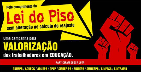 Os/as trabalhadores/as em educação da Paraíba e do Brasil vivem um momento extremamente delicado, não apenas no que diz respeito à sua remuneração – que representa um abuso da elite política desse país -, como também à sua valorização enquanto profissionais de uma área que, via de regra, é considerada FUNDAMENTAL e PRIORITÁRIA para o futuro de qualquer nação que deseje, concretamente, se tornar desenvolvida.