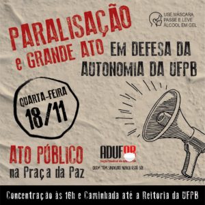 “A ADUFPB convoca todos os professores e todas as professoras a participarem desta atividade e defenderem o princípio básico da autonomia universitária. Se não puderem estar presentes em razão dos cuidados com a pandemia, apoiem pelas redes sociais, posicionem-se, expliquem à comunidade o que está acontecendo na UFPB, compartilhem o material de divulgação produzido pelo sindicato. É preciso que a categoria esteja unida para quem mostremos que a UFPB não vai aceitar essa intervenção!”, comenta o professor Fernando Cunha, presidente da ADUFPB.